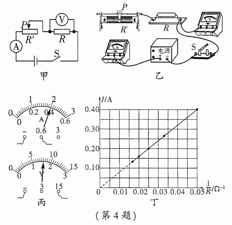 (3)以电阻的倒数为横坐标,电流I为纵坐标,在坐标系中描点并作出I-1/R图像,如图丁所示。由I-1/R图像可初步得出结论:在电压一定时,通过导体中的电流跟导体的电阻的倒数成