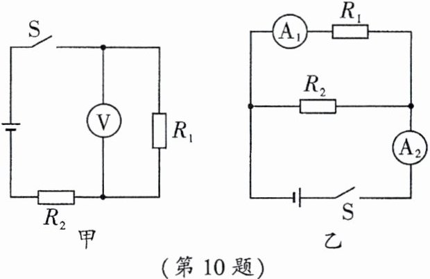 10. 如图甲所示电路,电源电压保持不变,其中$R_{2}= 5\ \Omega$,闭合开关S后,电路中的电流大小为0.4 A,电压表的示数为6 V,则电阻$R_{1}$大小为