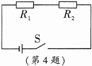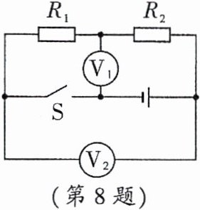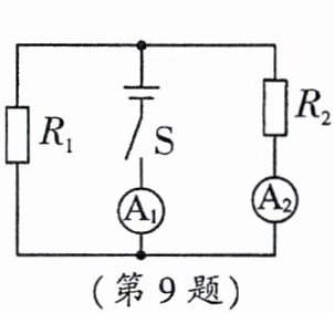 9. 电阻$R_{1}$、$R_{2}$阻值相等,连接在如图所示电路中。当开关S闭合时,电阻$R_{1}与R_{2}$两端的电压之比为