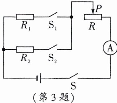 3. (2025·巴蜀)如图所示电路中,电源电压保持恒定,电阻$R_1$的阻值为10 Ω,电阻$R_2$的阻值为40 Ω,只闭合开关S和$S_1,$将滑动变阻器R的滑片P从最左端移到最右端的过程中,电流表的示数从0.2 A逐渐增大到0.6 A,求: