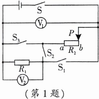 1. 如图所示电路中,电源电压恒定,滑动变阻器的滑片P移到b端。$R_1$与$R_2$组成串联电路,需要闭合开关