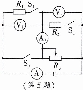 5. 如图所示,电源电压为$12 V,R_1、$$R_2$为定值电阻$,R_2= 20 Ω,R_3$为滑动变阻器,其铭牌上标有“? Ω 2 A”字样。将滑动变阻器$R_3$的滑片调至最左端,当只闭合开关$S_3$时,电流表A的示数为0.4 A;保持滑片位置不变,当只闭合开关$S_1$时,电压表$V_1$的示数为3 V。求: