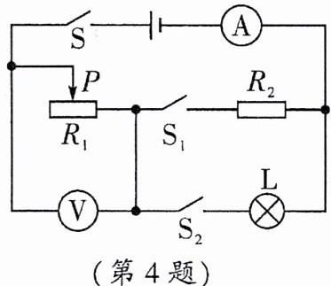 (3)只闭合开关$S$和$S_2$时,$L$与$R_1$串联,电压表测$R_1$两端的电压,电流表测电路中的电流。