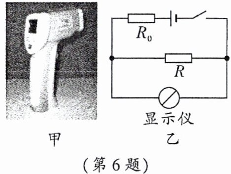 6.(2025·南开)如图甲是红外线测温枪,图乙是工作原理图,其中电源电压保持不变,$R$为热敏电阻用于靠近人体测温,定值电阻$R_0$为保护电阻。在测量人的体温时显示仪的示数会随被测者体温的升高而变大,则下列分析中正确的是(