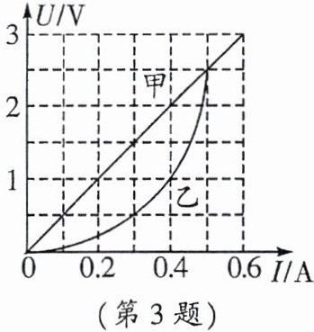 3. 如图所示是定值电阻甲和小灯泡乙的$U-I$图像,若将甲和乙并联接入电源电压为$1\ V$的电路中,则干路电流为