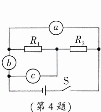4.(2025·一中)如图所示的电路中,电源电压保持不变,$a、b、c$三处可分别接入电流表或电压表。闭合开关$S$,$R_1和R_2$串联,则电表$b$为______(选填“电压”或“电流”)表,此时$a、c$两表的指针偏转角度相同;若想让$R_1、R_2$并联,则$a、c$两表的示数之比为______。