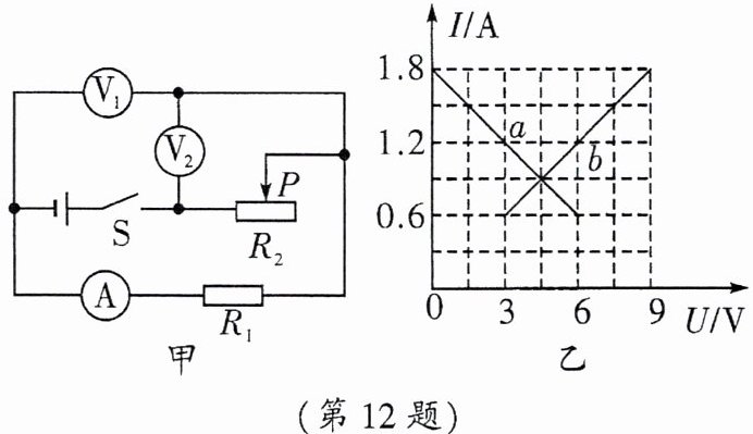 12.(2025·一中)如图甲所示电路,电源电压保持不变。闭合开关,当滑动变阻器的滑片$P$从一端滑到另一端的过程中,两个电阻的$I-U$关系图像如图乙所示,其中图像$a$为电阻