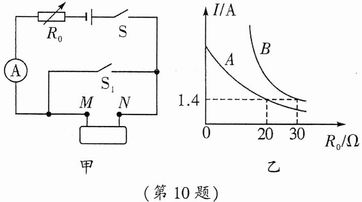 10.(2024·泰州)电子技师社团活动中小明对一个暗箱进行研究。暗箱表面有两个接线柱$M、N$,内部只接有$R_1和R_2$两个定值电阻,$R_1阻值为6\ \Omega$,$R_2$阻值未知。小明用图甲所示的电路(电源电压不变)进行实验,在$S、S_1都闭合和S$闭合、$S_1$断开的两种情况下,改变电阻箱$R_0$的阻值,读取电流表示数$I$,绘制了如图乙所示的$I随R_0$变化的曲线。下列判断中正确的是(
