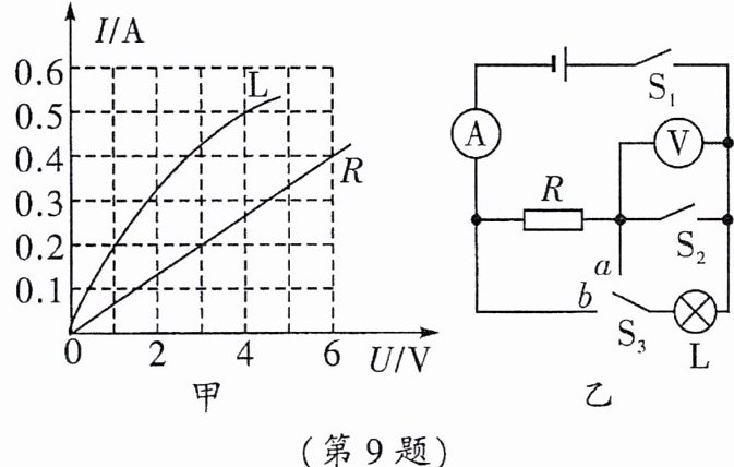 9. 图甲是小灯泡$L和定值电阻R的I-U$图像。将小灯泡$L和定值电阻R$接入图乙所示的电路中,电源电压恒为$4\ V$,$S_3$是单刀双掷开关。$S_1$闭合后,下列说法中正确的是(