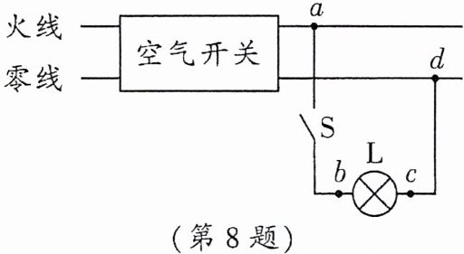 8. 在如图所示的照明电路中,闭合开关$S$后,发现灯泡$L$不亮,用测电笔分别检测$b、c$两点,氖管都发光。若电路中只有一处故障,则可能是(