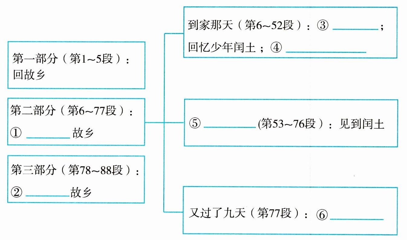 为序,以“我”的见闻、感受为线索。依据这个线索,文章可分为三个部分。试梳理文章结构,完成下面的表格。| 第一部分(第1~5段):回故乡 | 第二部分(第6~77段):①