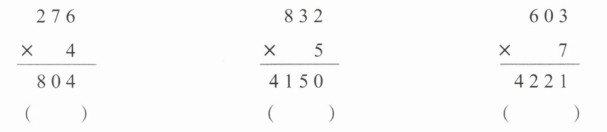 第一个算式:$276×4$,计算过程为:$6×4=24$,写$4$进$2$;$7×4=28$,$28+2=30$,写$0$进$3$;$2×4=8$,$8+3=11$,结果为$1104$,原式计算结果$804$错误。