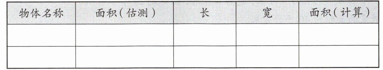 解析:本题考查长方形和正方形面积的计算,以及估测和实际测量能力。需要先对物体表面的面积进行估测,然后通过测量长和宽,利用长方形面积公式$S = a× b$($S$表示面积,$a$表示长,$b$表示宽)或正方形面积公式$S = a× a$($S$表示面积,$a$表示边长)来计算实际面积。