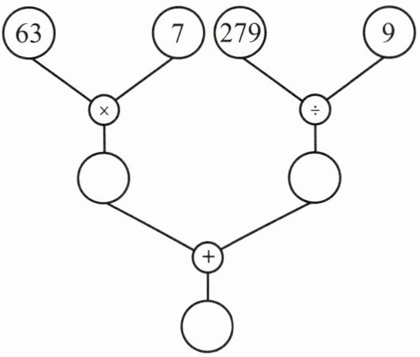 $63 × 7 = 441$;$279 ÷ 9 = 31$;$441 + 31 = 472$
