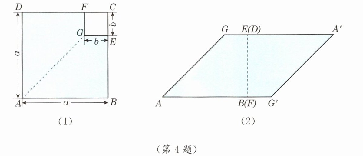 如图(1),正方形$ABCD的边长为a$,正方形$ECFG的边长为b$,其中点$E$、$F分别在边BC$、$CD$上。一方面,涂色部分的面积等于两个正方形的面积之差,为$\underline{