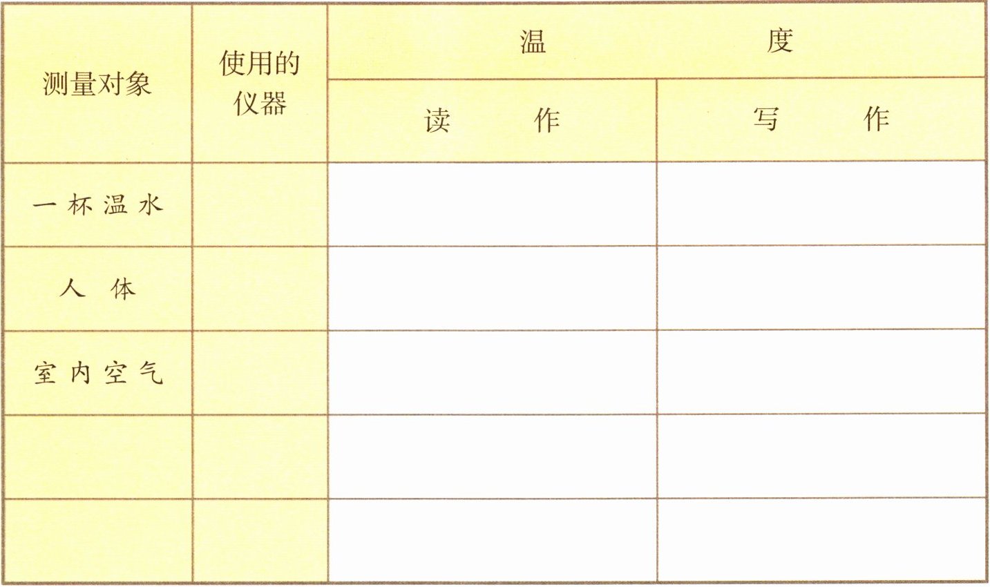 假设测量一杯温水温度为$40^{\circ}C$,读作“四十摄氏度” ;人体温度一般约为$37^{\circ}C$,读作“三十七摄氏度” ;室内空气温度假设为$25^{\circ}C$,读作“二十五摄氏度” 。