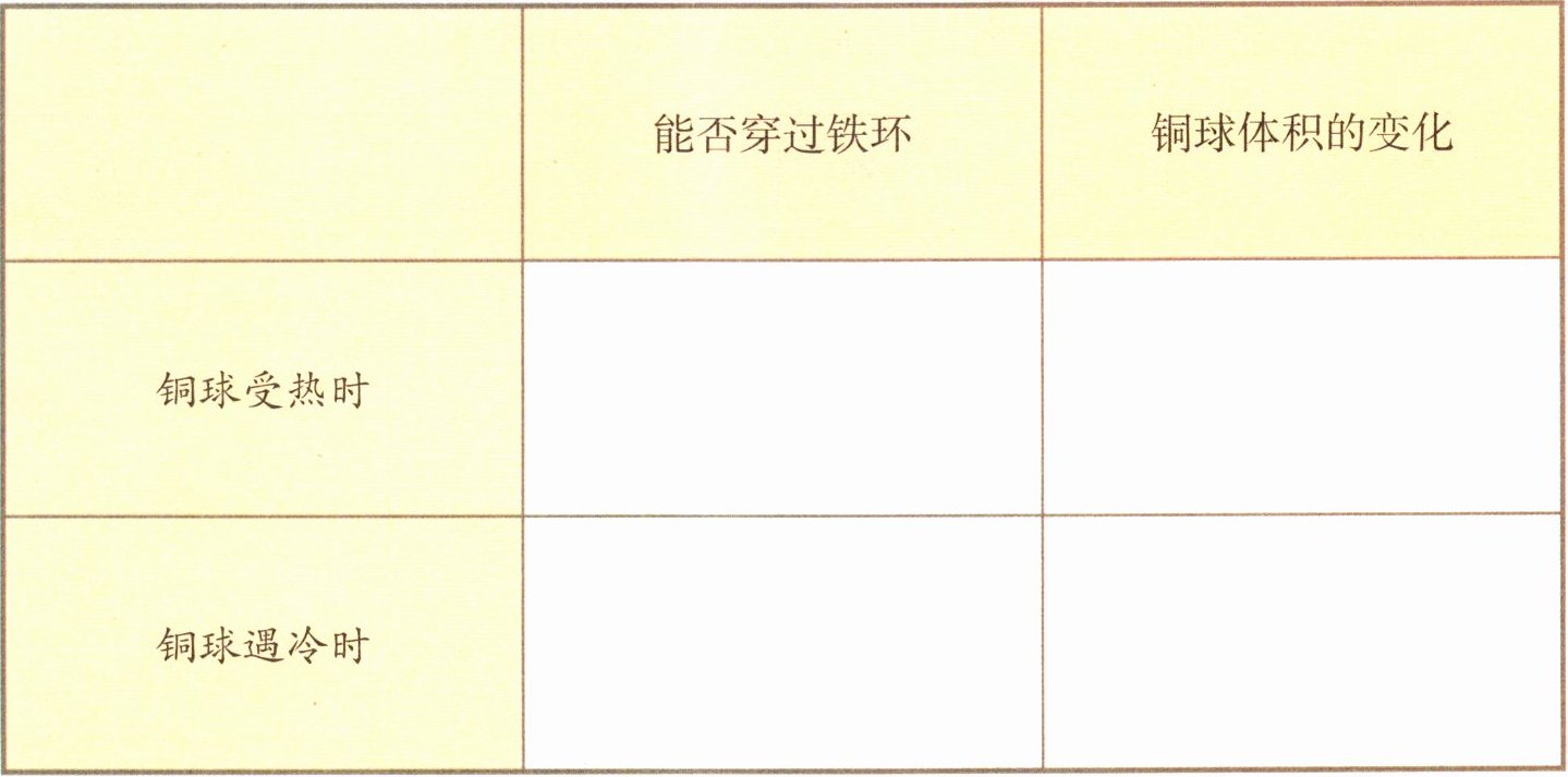 | |能否穿过铁环|铜球体积的变化|