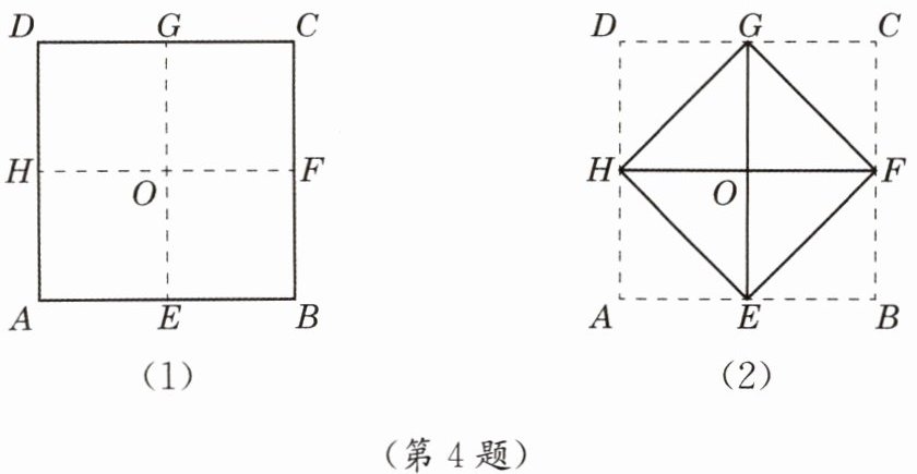 4. 将边长为 10 cm 的正方形纸片 ABCD 对折两次,折成边长为 5 cm 的小正方形后再打开,得到各边中点 E、F、G、H,折痕 EG、HF 交于正方形中心 O,如图(1)所示. 将正方形 ABCD 折叠,使顶点 A、B、C、D 分别与点 O 重合,得正方形 EFGH,如图(2)所示. 完成下列填空: