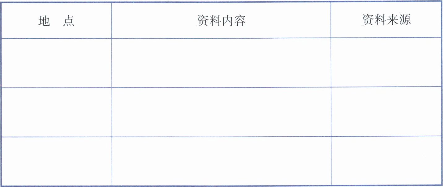 【解析】:本题为科学实践记录题目,考查六年级学生对资料收集与整理的能力,需要明确不同地点所对应的资料内容以及资料来源,通过实际调查、查阅书籍、网络检索等方式获取信息并准确填写。