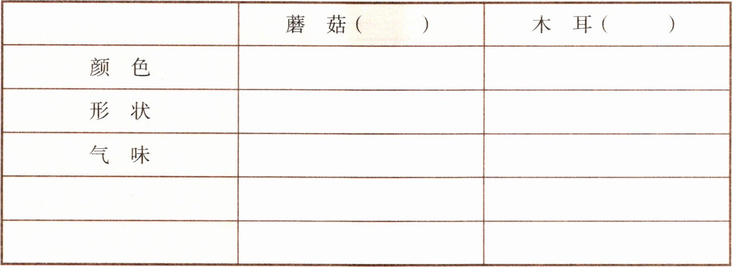 本题考查对蘑菇和木耳的观察与记录,涉及科学学科中观察生物特征的知识点。解题关键在于通过实际观察或参考相关资料,准确填写蘑菇和木耳在颜色、形状、气味等方面的特征,同时列举常见的食用菌。