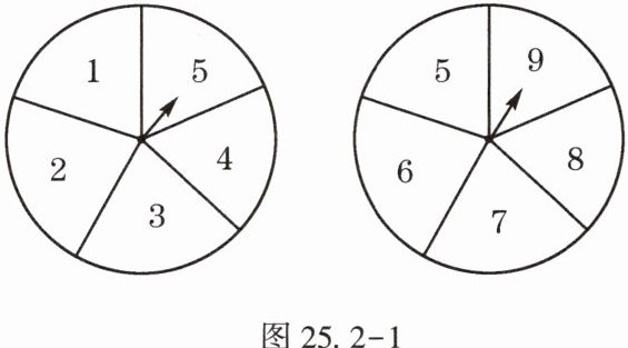 5. (★)如图 25.2 - 1 所示,同时自由转动两个质地均匀的转盘,指针落在每一个数上的机会均等,转盘停止后,两个指针同时落在奇数上的概率是______。