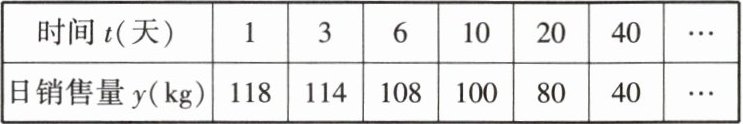 | 日销售量$y$(kg) | $118$ | $114$ | $108$ | $100$ | $80$ | $40$ | …$$ |