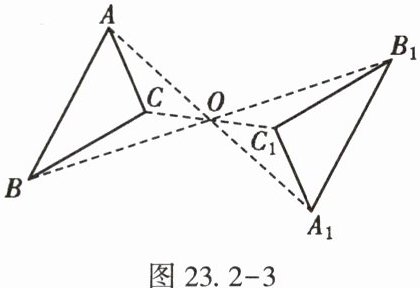 5. (★) 如图 23.2 - 3,$\triangle ABC与\triangle A_{1}B_{1}C_{1}关于点O$成中心对称,有下列说法:①$\angle BAC= \angle B_{1}A_{1}C_{1}$;②$AC = A_{1}C_{1}$;③$OA = OA_{1}$;④$\triangle ABC与\triangle A_{1}B_{1}C_{1}$的面积相等. 其中正确的说法有【 】