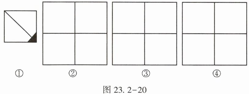 9. (★★)如图 23.2 - 20,用四块图①所示的正方形卡片拼成一个新的正方形,使拼成的图案是一个中心对称图形,请你在图②、图③、图④中各画出一种拼法. (要求三种拼法各不相同,且其中至少有一个既是轴对称图形又是中心对称图形)