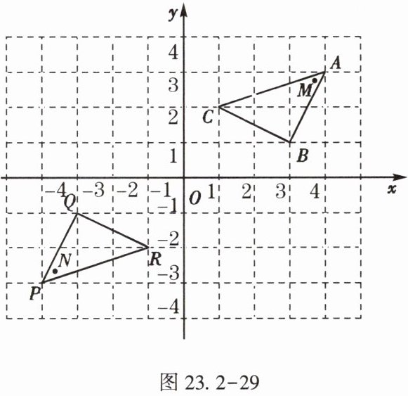 10.(★★)如图23.2-29,在平面直角坐标系中,$\triangle PQR是\triangle ABC$经过某种变换后得到的图形,观察点$A与点P$、点$B与点Q$、点$C与点R$的坐标之间的关系.在这种变换下,如果$\triangle ABC中任意一点M的坐标为(x,y)$,那么它的对应点$N$的坐标是____.
