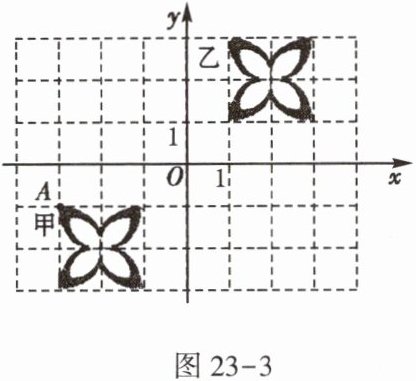 5. ($★$)如图$23 - 3$,将一朵小花放置在平面直角坐标系中第三象限内的甲位置,先将它绕原点$O旋转180^{\circ}$到乙位置,再将它向下平移$2$个单位长度到丙位置,则小花顶点$A在丙位置的对应点A'$的坐标为【】