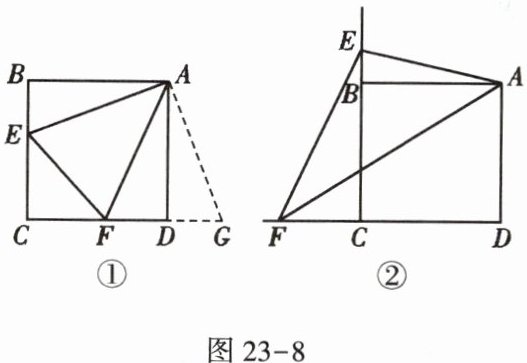 (2)类比引申:如图$23 - 8$②,点$E$,$F分别在正方形ABCD的边CB$,$DC$的延长线上,$\angle EAF = 45^{\circ}$。连接$EF$,试猜想$EF$,$BE$,$DF$之间的数量关系,并给出证明。