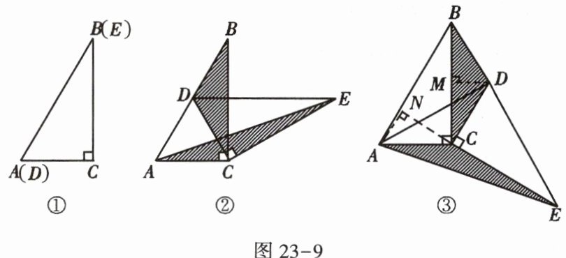如图$23 - 9$②,固定$\triangle ABC$,使$\triangle DEC绕点C$旋转。当点$D恰好落在AB$边上时,填空: