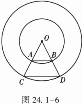 14. (★★)如图24.1-6,已知两个同心圆的圆心为$O$,大圆的半径$OC$,$OD分别交小圆于A$,$B$两点,判断$AB与CD$的位置关系并说明理由.
