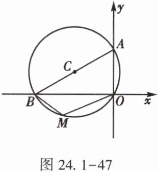 18. (★★)如图 24.1-47,$\odot C$过原点,且与两坐标轴分别交于点$A$,$B$,点$A的坐标为(0,4)$,$M是第三象限内\overset{\frown}{OB}$上一点,$\angle BMO = 120^{\circ}$.