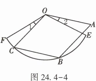 9. (★★)如图24.4 - 4,四边形$OABC$是菱形,点$B$,$C在以点O为圆心的\overset{\frown}{EF}$上,且$\angle 1 = \angle 2$,若扇形$OEF的面积为3\pi$,则菱形$OABC$的边长为【 】