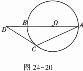 13.(★★)如图24-20,$AB$ 是$\odot O$ 的直径,点 $D$ 在 $AB$ 的延长线上,$DC$ 切$\odot O$ 于点 $C$,若$\angle A = 25^{\circ}$,则$\angle D$ 的度数为 【 】