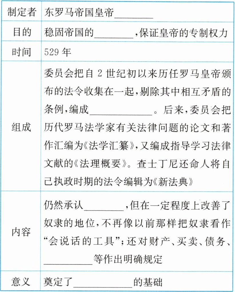 |组成|委员会把自 2 世纪初以来历任罗马皇帝颁布的法令收集在一起,剔除其中相互矛盾的条例,编成______。后来,委员会把历代罗马法学家有关法律问题的论文和著作汇编为《法学汇纂》,又编成指导学习法律文献的《法理概要》。查士丁尼还命人将自己执政时期的法令编辑为《新法典》|