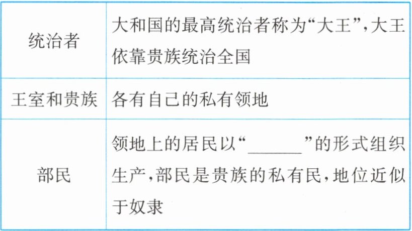 |部民|领地上的居民以“______”的形式组织生产,部民是贵族的私有民,地位近似于奴隶|