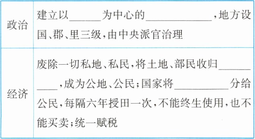 |经济|废除一切私地、私民,将土地、部民收归______,成为公地、公民;国家将______分给公民,每隔六年授田一次,不能终生使用,也不能买卖;统一赋税|