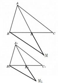 证明:如图,等倍延长中线AD、$A_1D_1$至M和$M_1,$连接BM和$B_1M_1,$