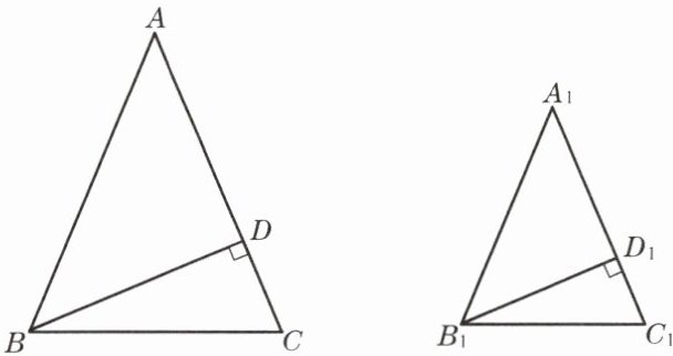 2. 已知:如图,在△ABC 与△A_1B_1C_1中,AB= AC,A_1B_1= A_1C_1,BD⊥AC,B_1D_1⊥A_1C_1,垂足分别为点 D、D_1,且$\frac{BD}{B_1D_1}= \frac{BC}{B_1C_1}$. 求证:△ABC∽△A_1B_1C_1.