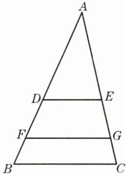 4. 如图,已知△ABC中,点D、F在边AB上,点E、G在边AC上,平行于BC的直线DE和FG将△ABC的面积分成相等的三部分,BC= 15厘米. 求DE、FG的长.