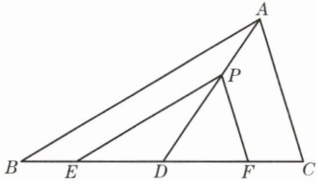 10. 已知:如图,P 是$\triangle ABC$的中线 AD 上的一点,$PE// AB$,$PF// AC$,PE、PF 分别与 BC 相交于点 E、F.求证:$BE= CF$.