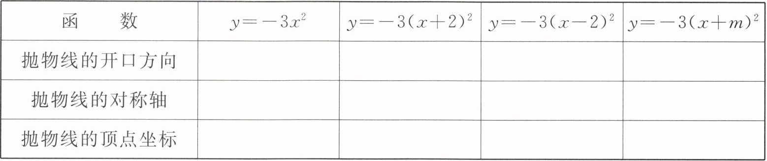 | 函 数 | $ y= -3x^2 $ | $ y= -3(x+2)^2 $ | $ y= -3(x-2)^2 $ | $ y= -3(x+m)^2 $ |