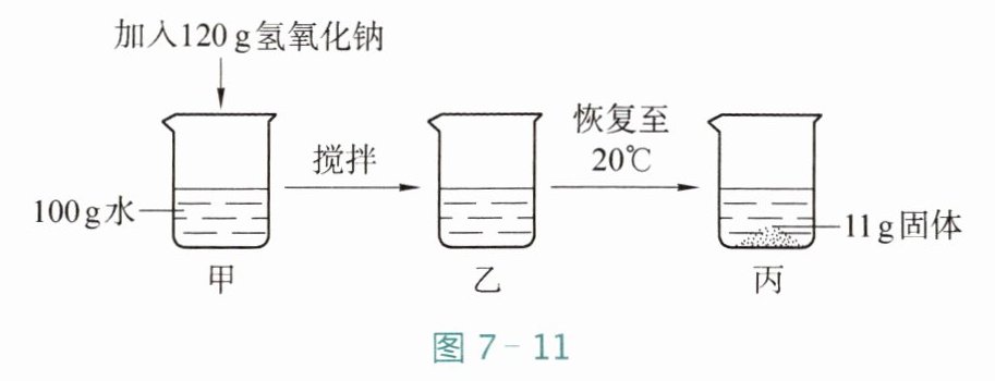 5. $20^{\circ}C$ 时,将 $120g$ 氢氧化钠固体加入 $100g$ 水中,搅拌后固体全部溶解。放置一段时间恢复至 $20^{\circ}C$ 后,析出 $11g$ 固体(实验过程中忽略水的损失),实验过程如图 7 - 11 所示。下列分析正确的是(