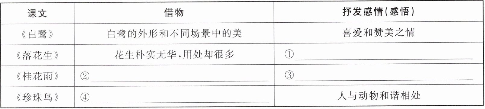 一、①要做有用的人 ②童年时与桂花相关的生活场景 ③思乡之情 ④小珍珠鸟与“我”亲近的过程