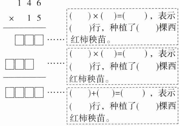 1 小小采摘园里种植了一批西红柿秧苗,每行种植146棵,种植了15行,一共种植了多少棵西红柿秧苗?根据下面的竖式,在( )里填数。