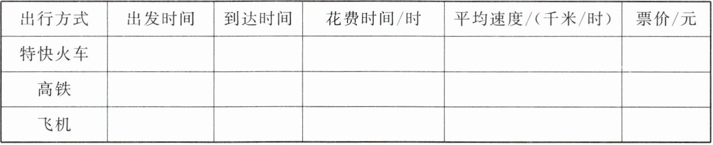 1. 特快火车、高铁、飞机相关数据填写无固定答案,根据假设数据填写。