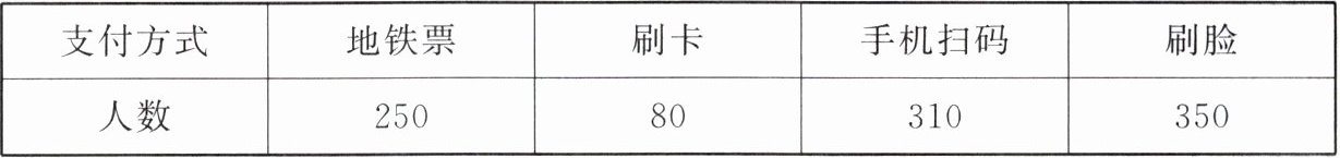3. 在互联网移动支付迅速普及的大背景下,很多地铁站增添了刷脸乘车的进站方式,智能乘车综合业务平台取得了阶段性成果,下表是某地铁站某时段乘地铁支付方式的人数统计表。