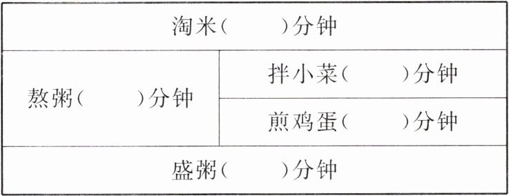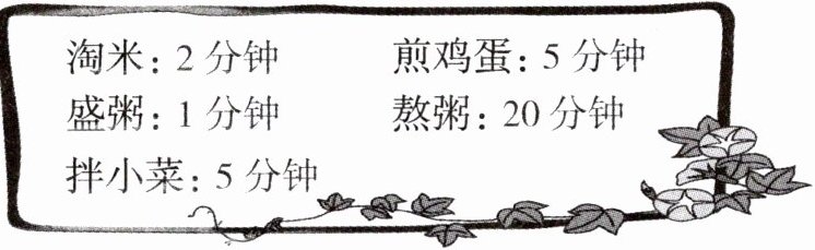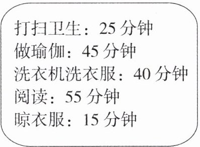 (方案不唯一) 25+45+55+15=140(分钟) 140分钟=2小时20分钟 8时30分+2小时20分钟=10时50分 她最早10:50可以出门。
